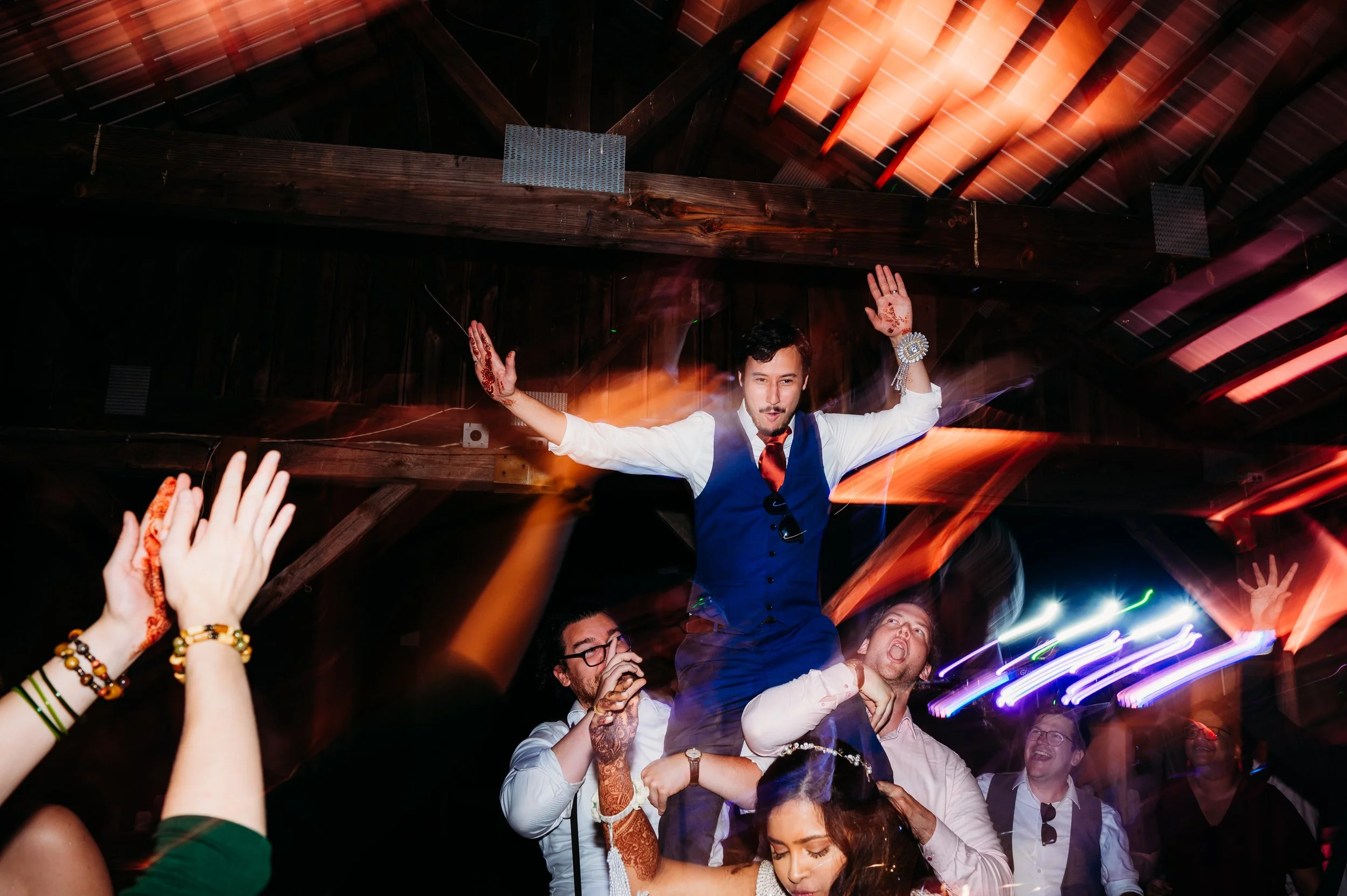And the very last part of your wedding day is the dancing! I love hitting the dance floor with my couple to kick off the party. What makes for great dancing photos? Lights, actually! Anything from string lights to chandeliers that are very dimly lit, to traditional DJ lights—I can move those lights, and they make for amazing partying photos.